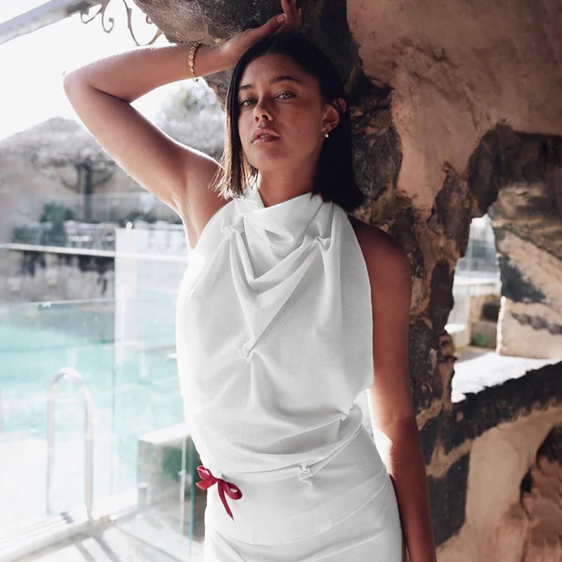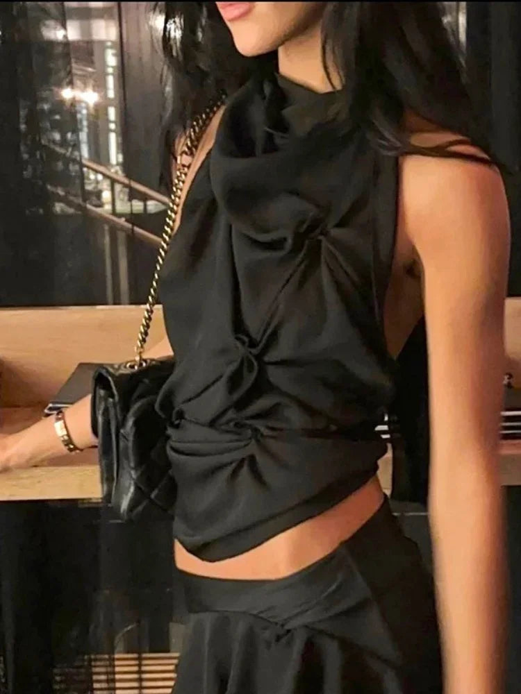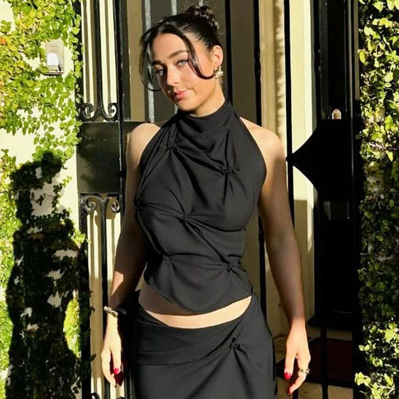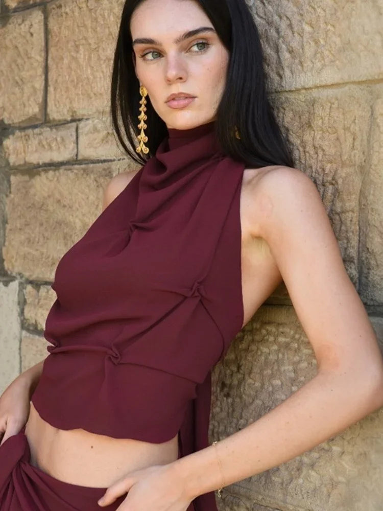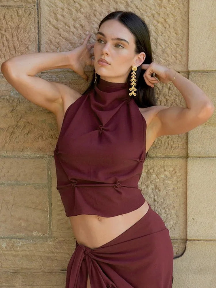 This high-neck crop owns the room with sculpted gathers, a sleeveless cut, and bold tie-back drama. Its rich tone and contour fit bring the energy—just add gold.
