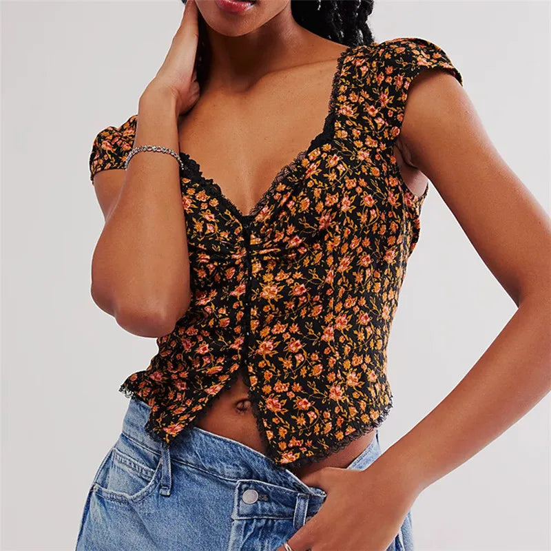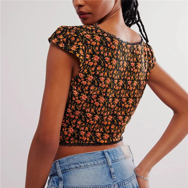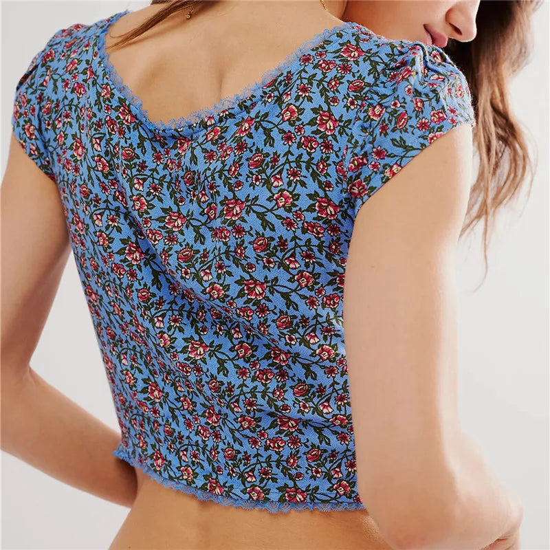 Sweet as summer and stitched for compliments. This lace-trimmed floral crop hugs you just right with its vintage-inspired cut and ruched center.