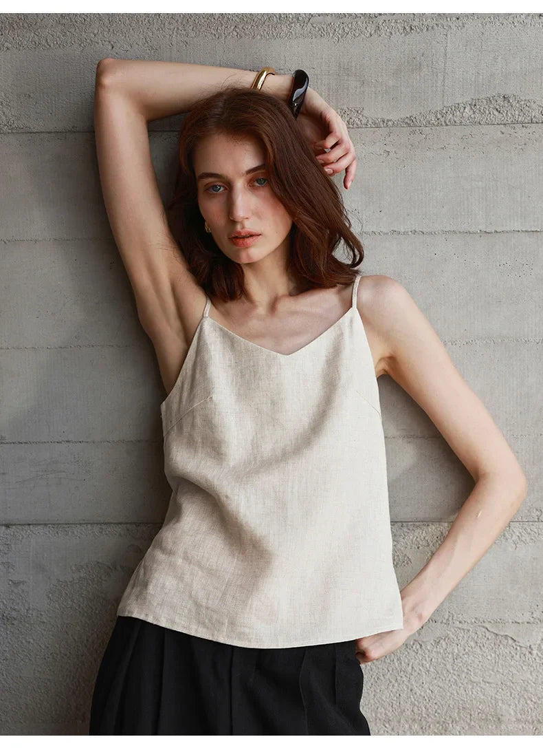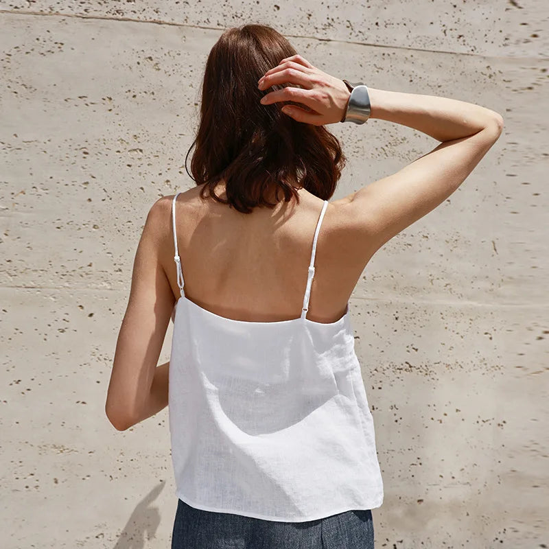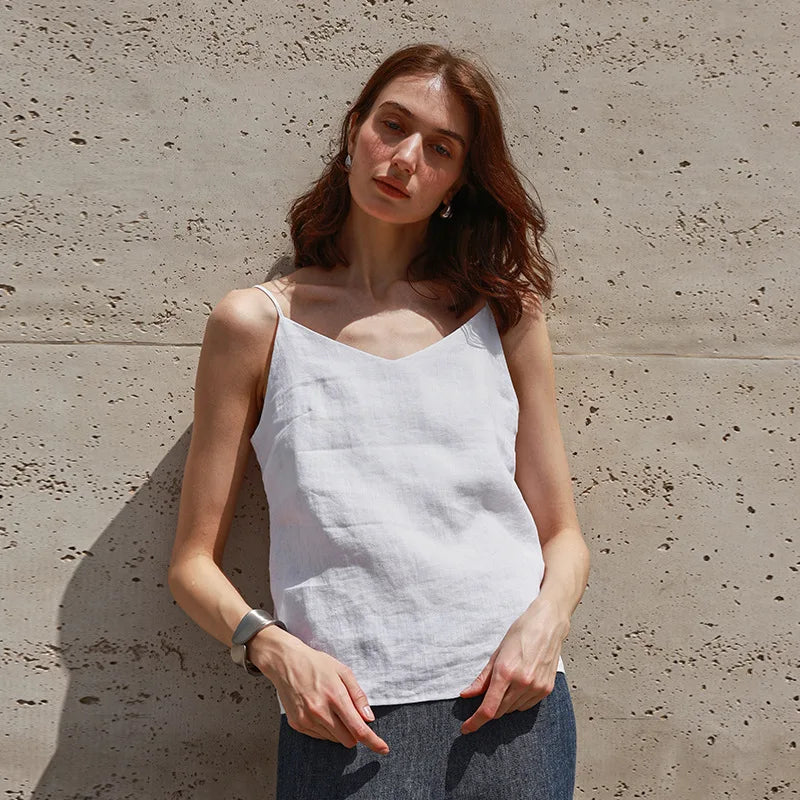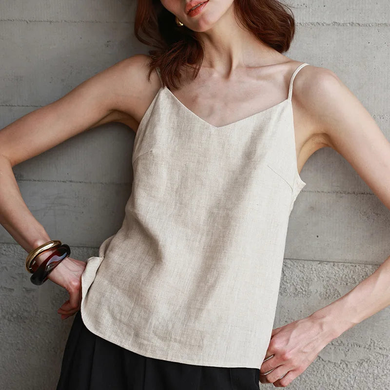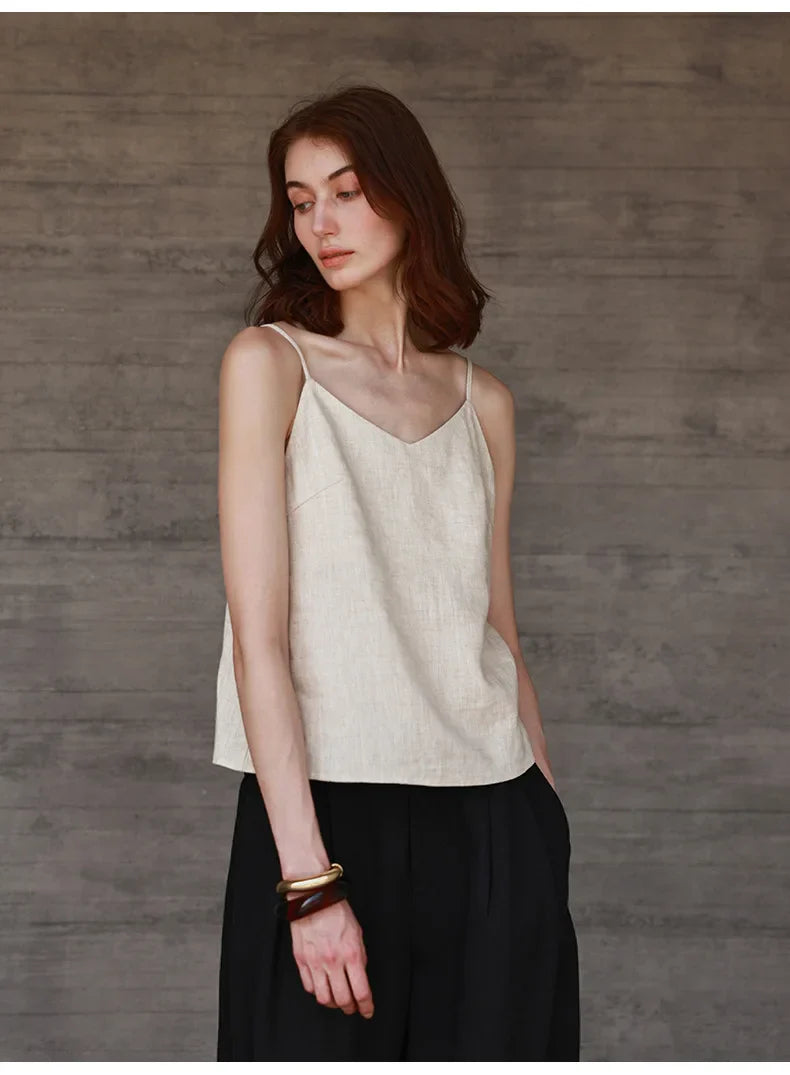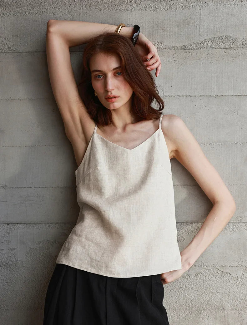 Clean, relaxed, and endlessly wearable. This lightweight linen camisole sits easy on the body with a soft V-neck and adjustable straps—perfect for warm days when you want effortless and unfussy.