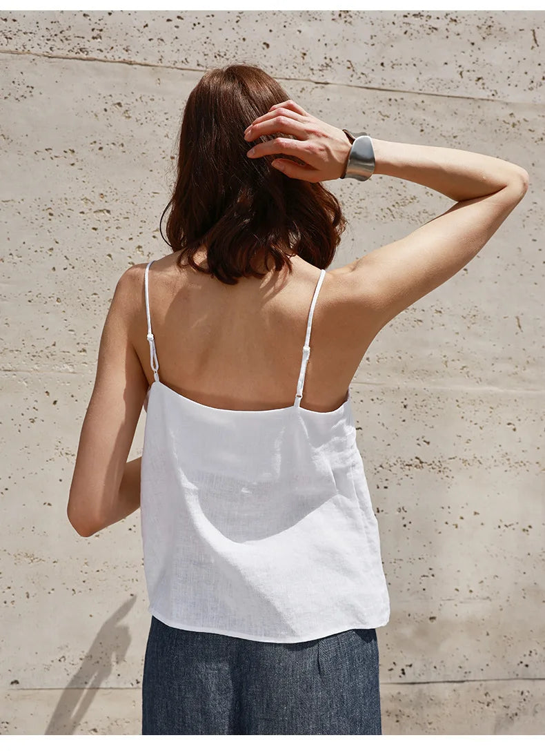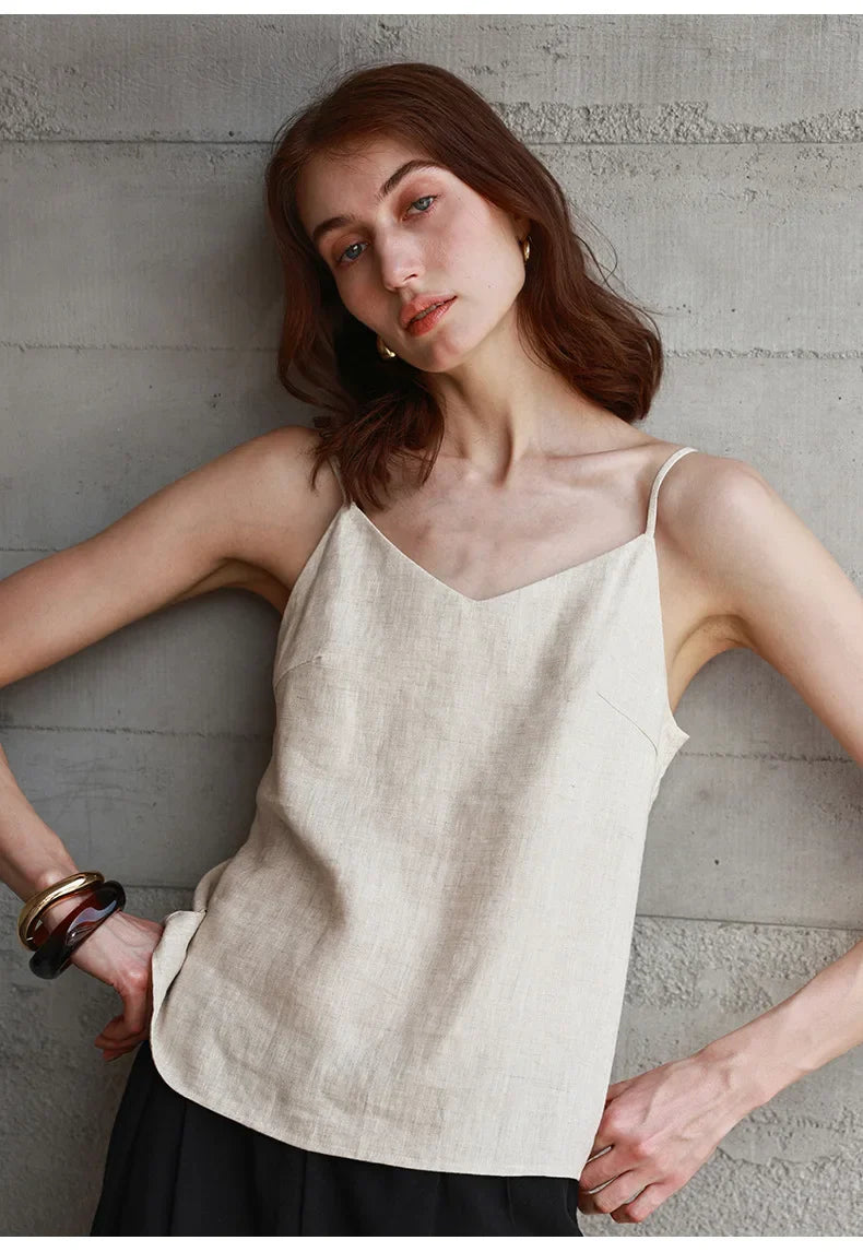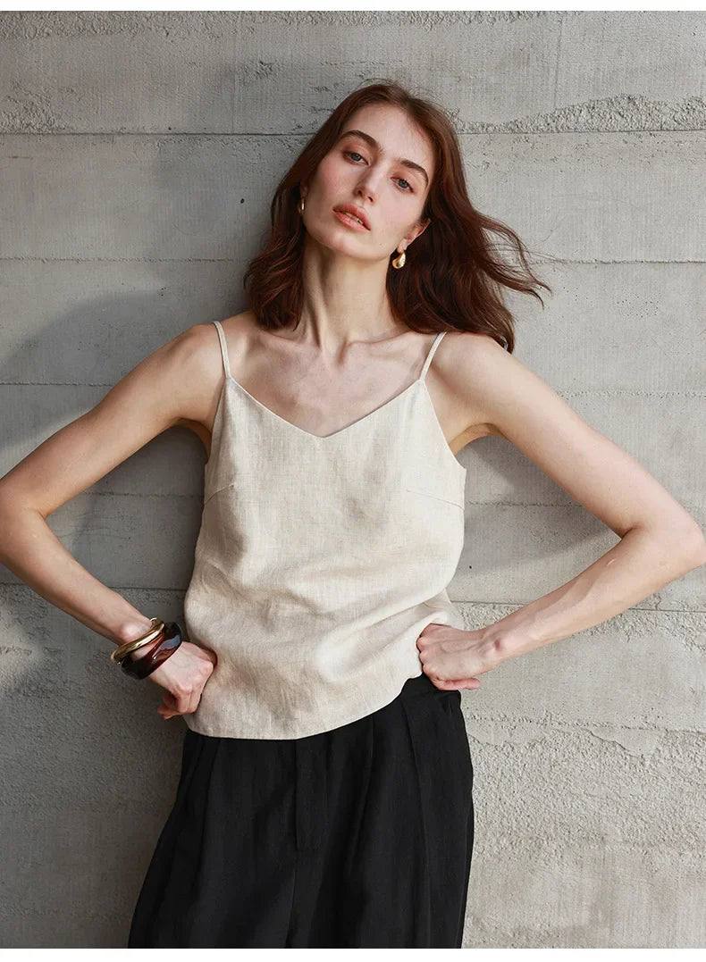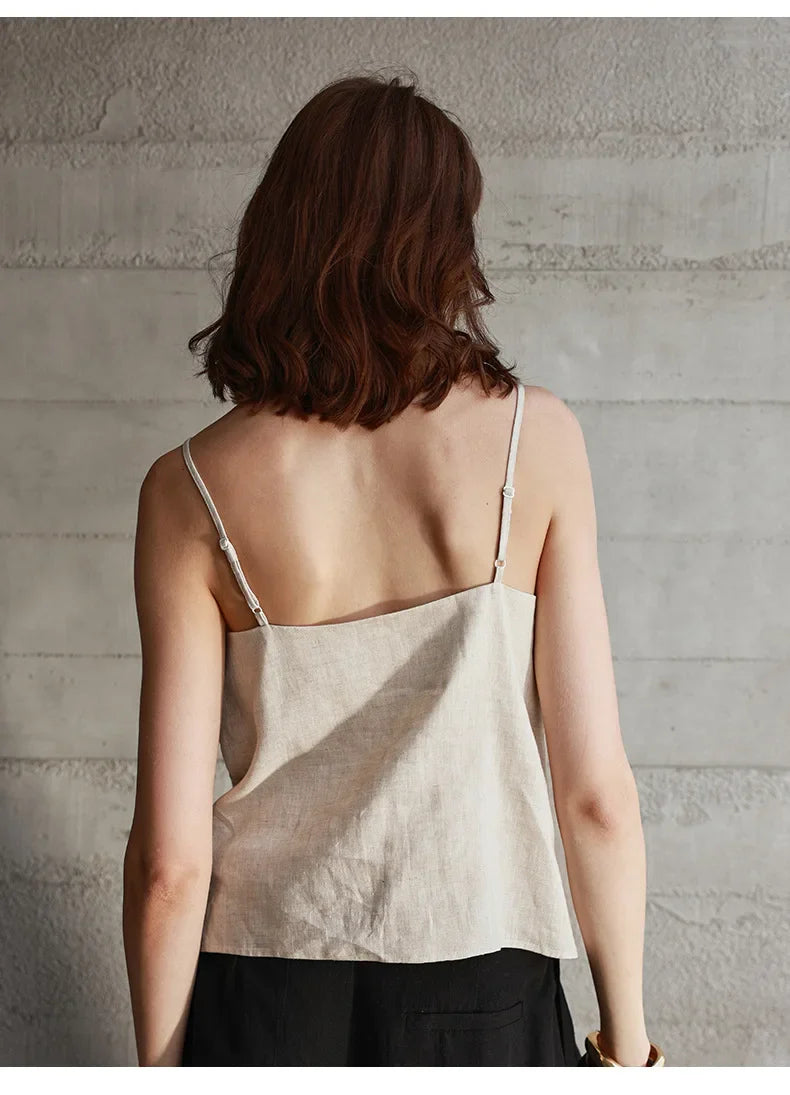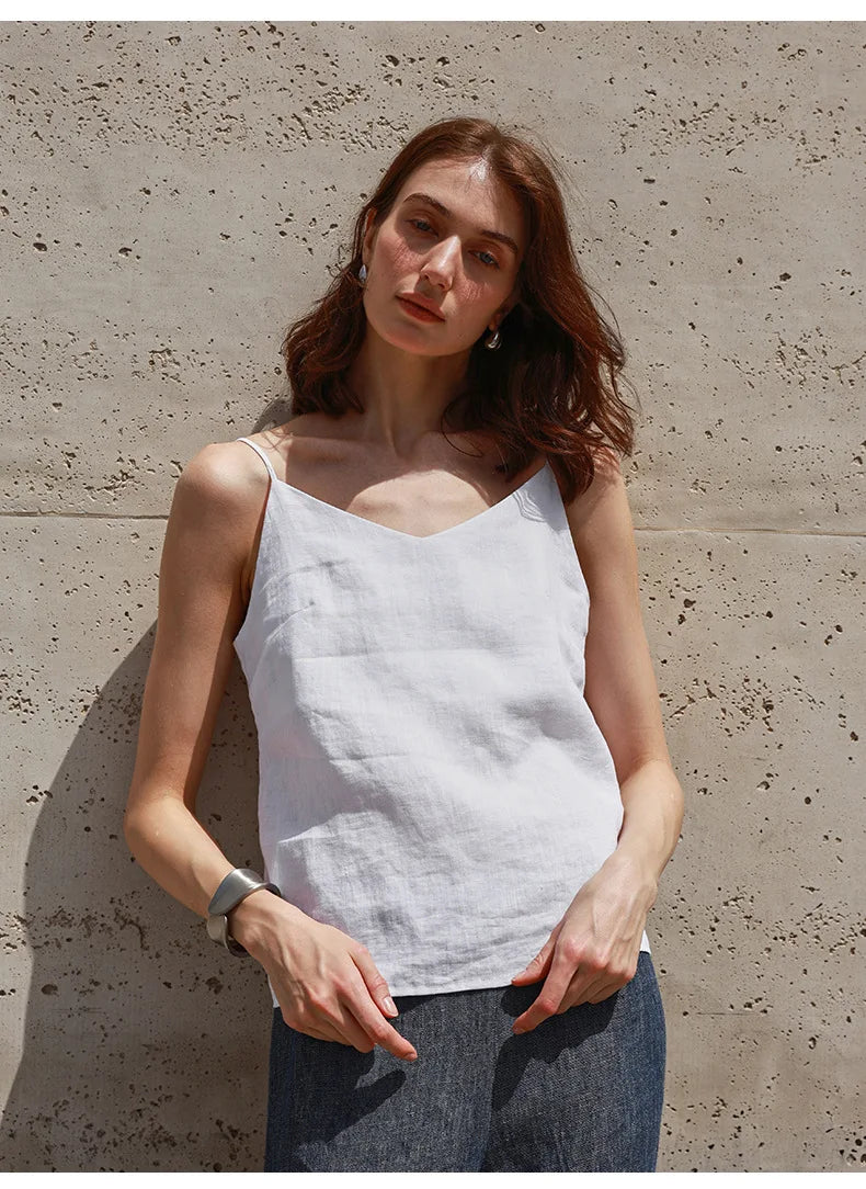 Clean, relaxed, and endlessly wearable. This lightweight linen camisole sits easy on the body with a soft V-neck and adjustable straps—perfect for warm days when you want effortless and unfussy.