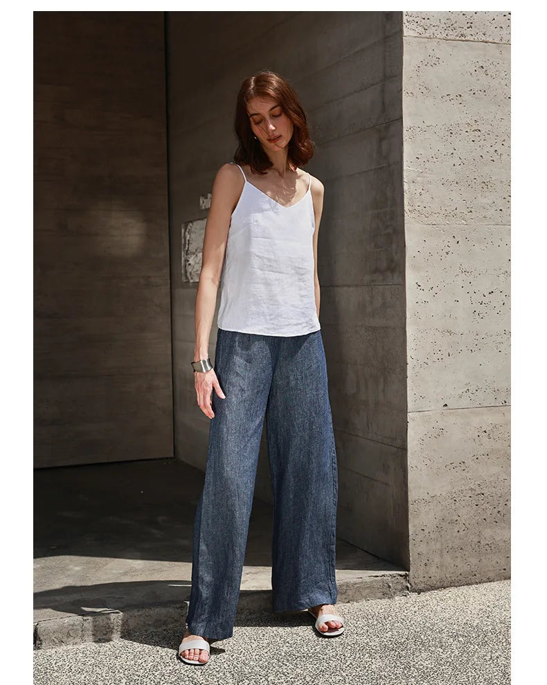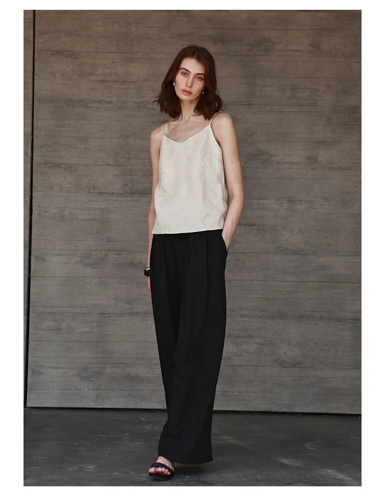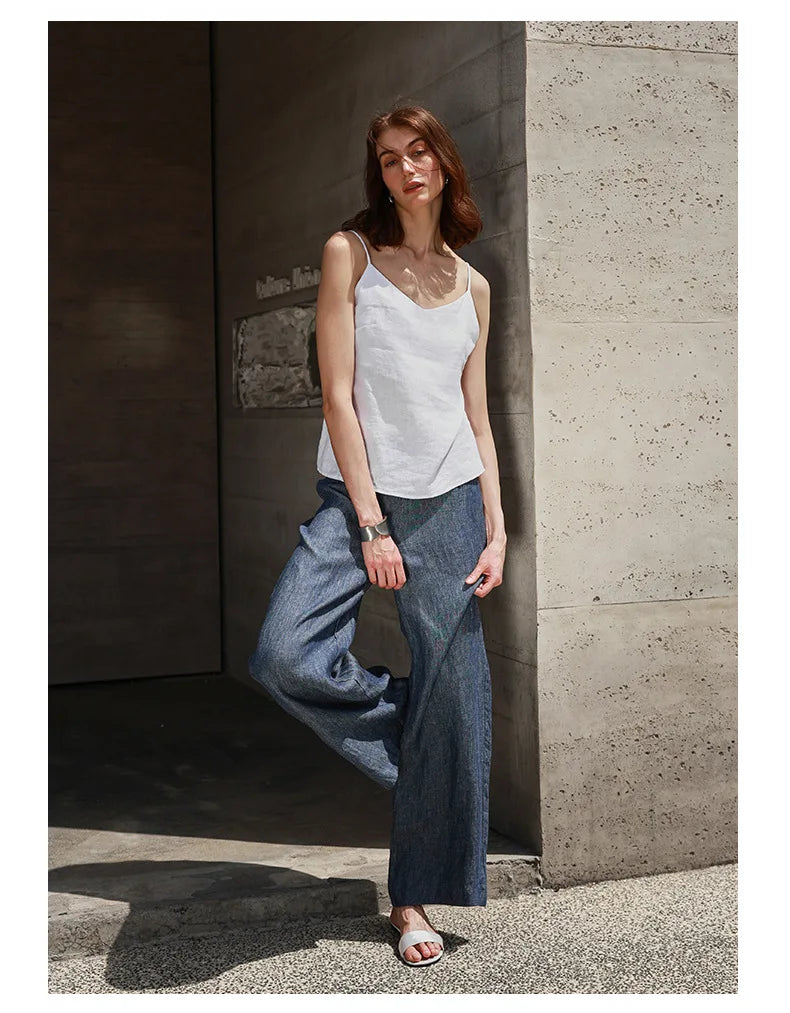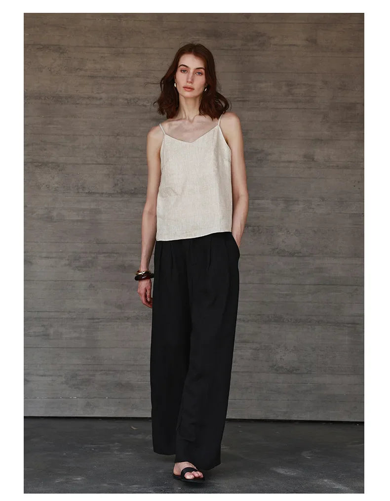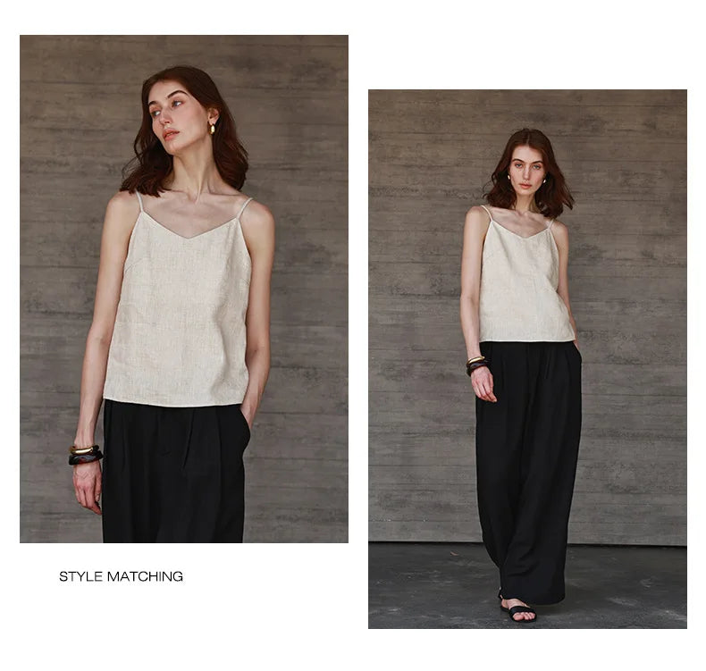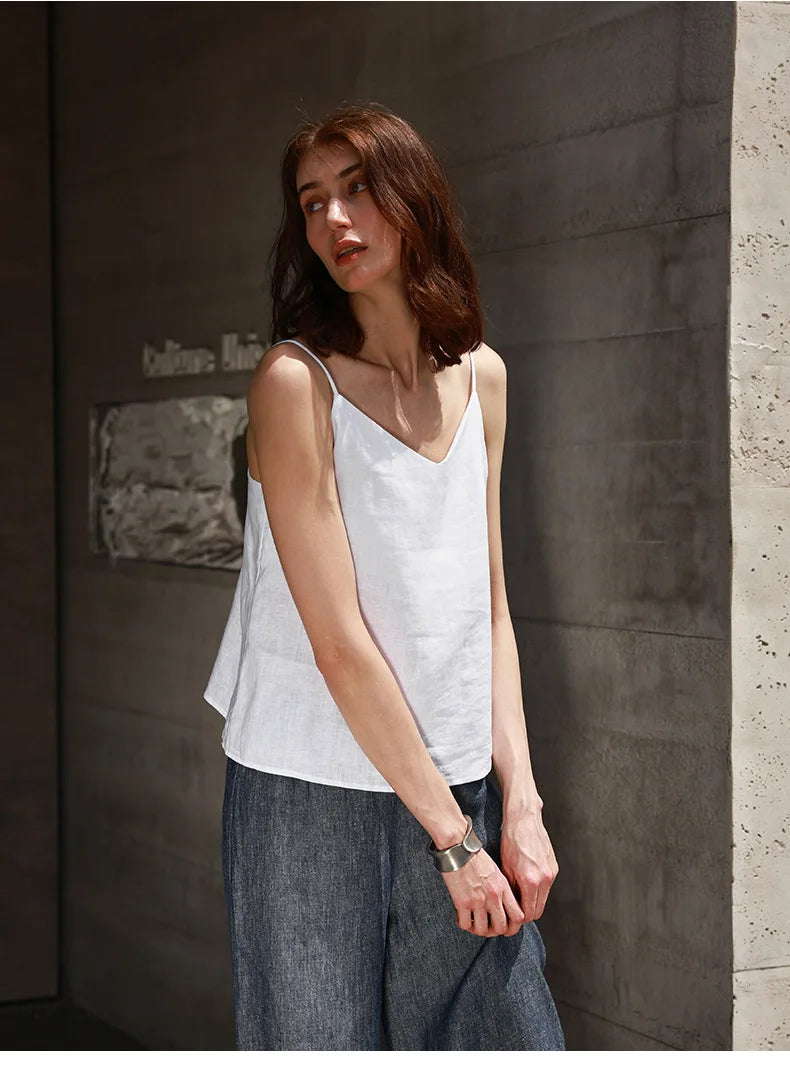 Clean, relaxed, and endlessly wearable. This lightweight linen camisole sits easy on the body with a soft V-neck and adjustable straps—perfect for warm days when you want effortless and unfussy.