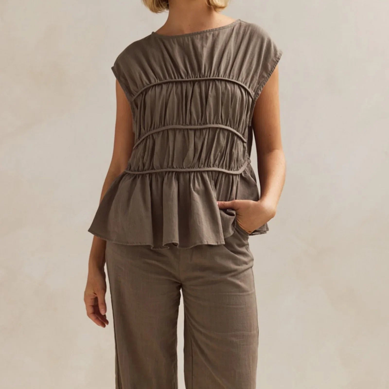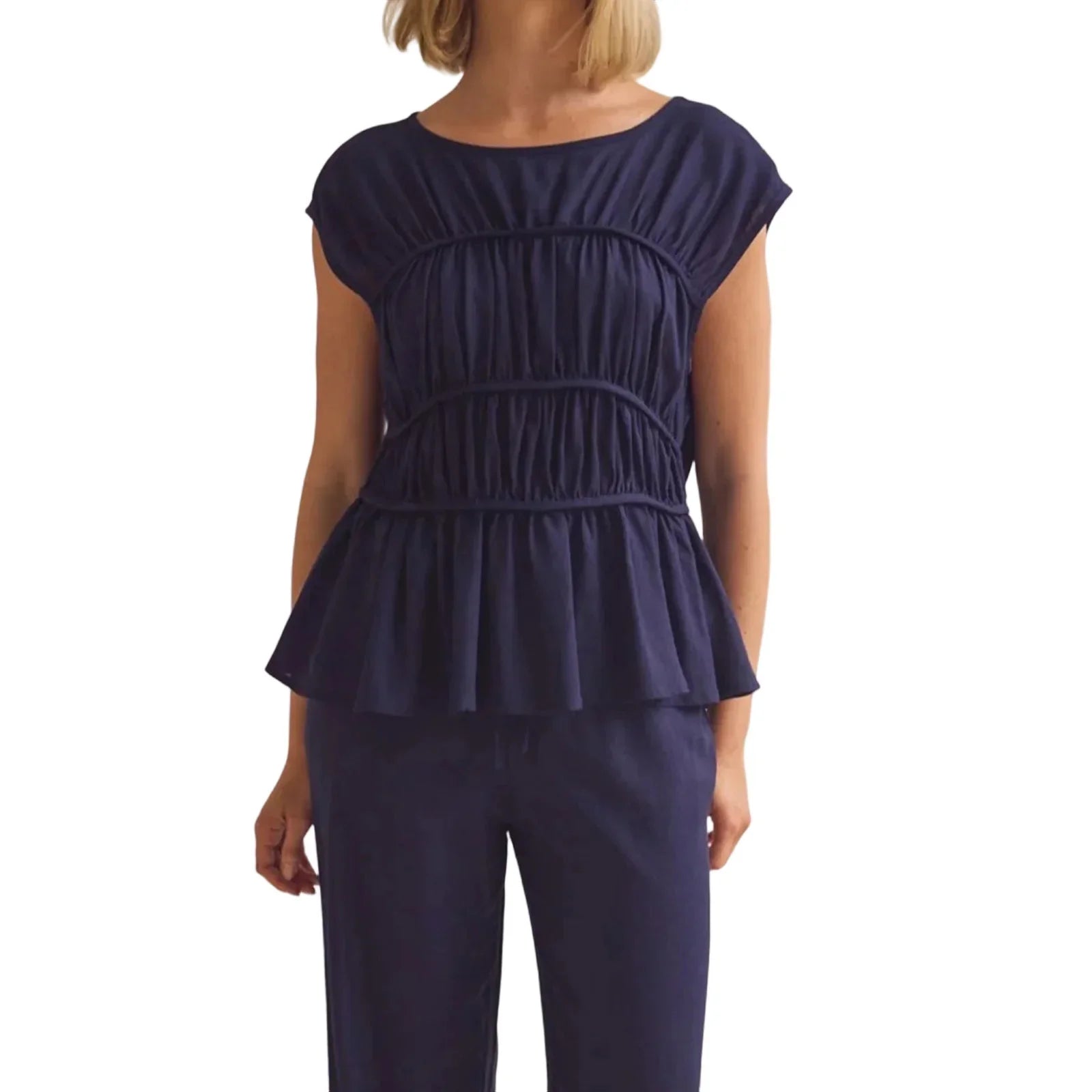 Soft structure, gentle movement, and an easy pull-together look that always feels intentional. The ruched bodice shapes without clinging, while the peplum hem gives balance that works just as well dressed up or worn casually.